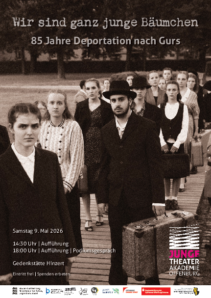 Im Jahr 1940 wurden mehr als 6.500 Jüdinnen und Juden in das französische Internierungslager Gurs deportiert. Anlässlich des 86. Jahrestages wird am 09.05.26 ein Theaterstück aufgeführt, bei dem junge Schülerinnen und Schüler aus Rheinland-Pfalz (Gymnasium Hermeskeil), dem Saarland (Geschwister-Scholl-Gymnasium Lebach), Baden-Württemberg (junge Theaterakademie Offenburg) und Frankreich (Lycée International Sain-Germain-en-Laye/Paris) mitwirken. Die Eigenproduktion wurde auf Initiative des Kuratoriums „Gedenken an die nach Frankreich deportierten Juden aus Baden und der ehemaligen Südpfalz“ von der jungen Theaterakademie Offenburg als Schülerprojekt inszeniert. Wir freuen uns, dieses länderübergreifende Projekt, vorstellen zu dürfen.